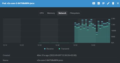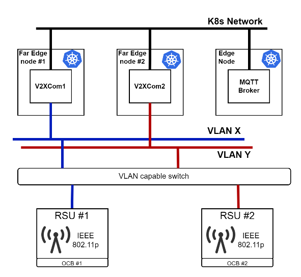 In the V2X network slicing scenario, Pledger creates an end-to-end network slice that can be used for communication among vehicles’ on-board units and road-side units. Using SOE, Pledger performs a virtual partition of a Kubernetes-based infrastructure, sets-up OSM to orchestrate network functions, and creates virtual networks with dedicated VLANs for the isolation of traffic coming from different road-side units (RSUs). The RAN Controller then performs the necessary radio configurations in the road-side units and, finally, the V2X slice is activated through the instantiation of a Kubernetes-based V2X software stack and the configuration of an Outside the Context of a BSS (OCB) interface for each radio device (i.e., for each road-side unit). The final slice configuration is shown in Fig. 1., whereas traffic associated to the V2X-Com pod from the V2X software stack in operation is shown in Fig. 2.