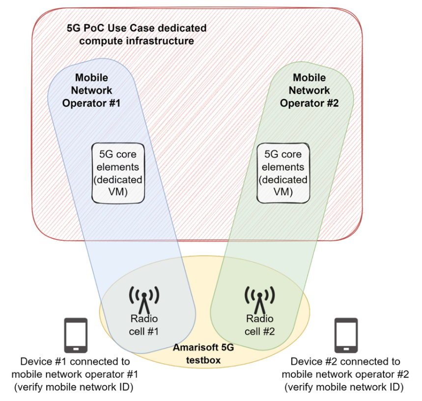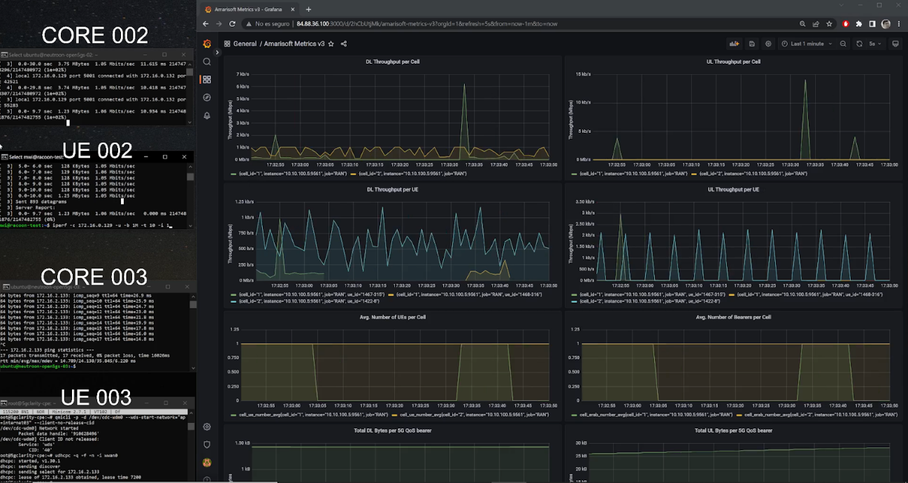 In the 5G network slicing scenario (Fig 3.), two isolated network slices with 5G NR elements are deployed, and the connectivity of user equipment to the slices is then showcased, along with relevant RAN-related metrics. During the deployment of 5G network slices, Pledger uses SOE to communicate with an Openstack-based infrastructure in order to create a compute chunk with some given amount of resources. Openstack is also used to create two isolated virtual networks per slice, needed for the management and data planes. The RAN Controller is used to select the desired radio cell from the Amarisoft 5G test-box hardware with relevant radio parameters. During the last step of the deployment, the SOE and RAN Controller are used to deploy the 5G cores, one for each MNO, to configure the PLMNIDs and to register users’ IMSIs. The two 5G cells start radiating and users registered to the two MNOs can now connect to their respective cells. Thanks to the isolation and dedicated use of resources introduced via slicing, the MNO 5G networks are completely independent and separated from each other even though they use a shared infrastructure. RAN metrics are gathered by the RAN Controller through a custom exporter running on an Amarisoft 5G test box (Fig. 4); these metrics are then retrieved by the RAN Controller’s Prometheus instance, which can be seamlessly integrated with Pledger’s monitoring engine and used for setting up SLAs.